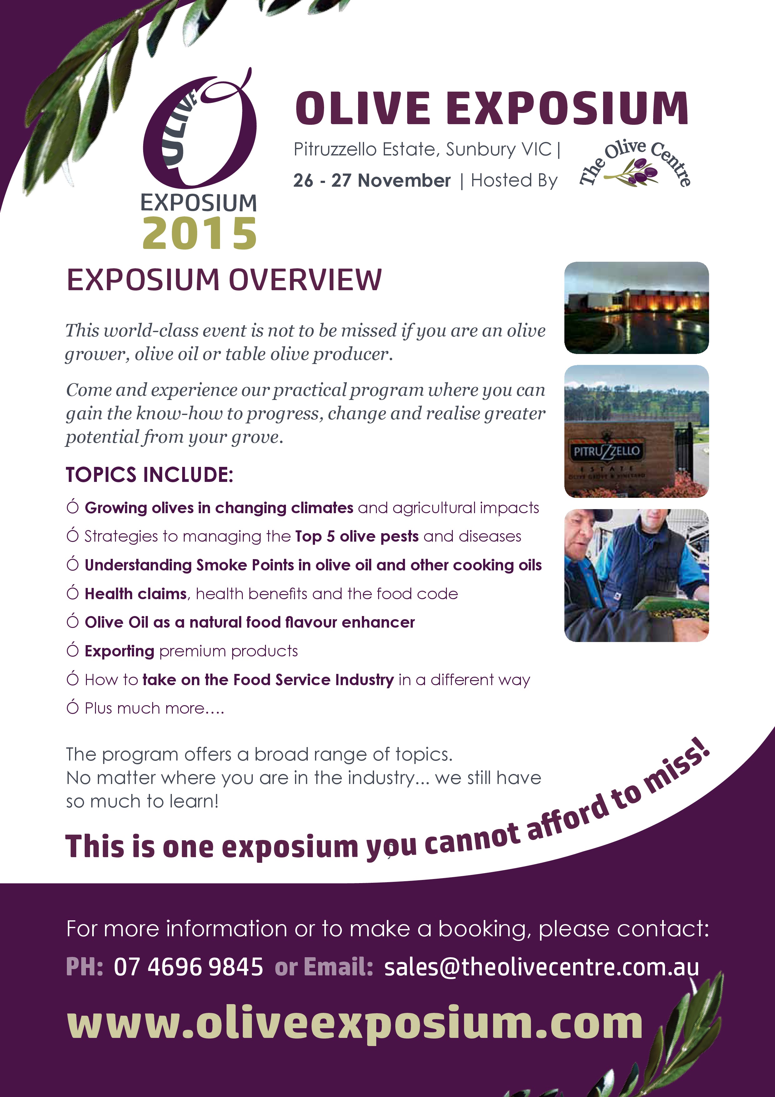 “Future direction, insight and innovation… making ideas happen” will be the focus of the 2017 Olive Exposium. Other international and nationally renowned speakers include Paul Vossen and Rick Cummisford from the USA and Australia’s own international olive oil sensory scientist and international olive oil judge, Dr Richard Gawel.